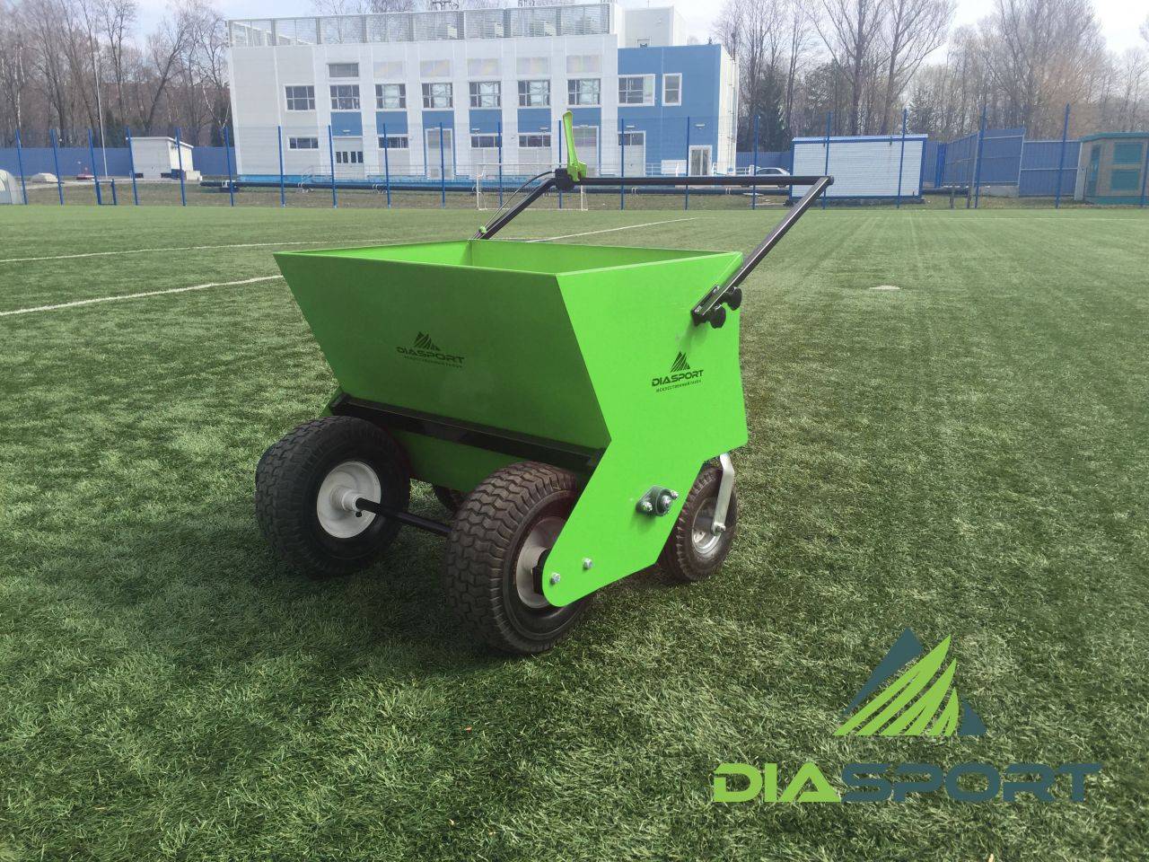 Главной особенностью данной модели является его способность трансформироваться из ручного агрегата в прицепной к садовому трактору или иному виду техники. Так же бункер имеет разворот 180о за счет пары поворотных независимых колес, это облегчает труд оператора и обеспечивает технику максимальной манёвренностью. Регулировка открытия заслонки позволяет контролировать объем высыпаемого содержимого, а отключаемый вал с лопастями, экономит содержимое, во время стоянки или движения к месту рассыпки. DiaSport E – 100 выполнен из стального корпуса 1,5мм, 4 пневматических газонных колеса, регулировку заслонки бункера при помощи винта, рукоятку размыкания привода вала с лопастями. Вся конструкция окрашена порошковой покраской, обеспечивая блеск и защиту от коррозии на весь срок службы техники.